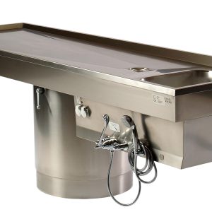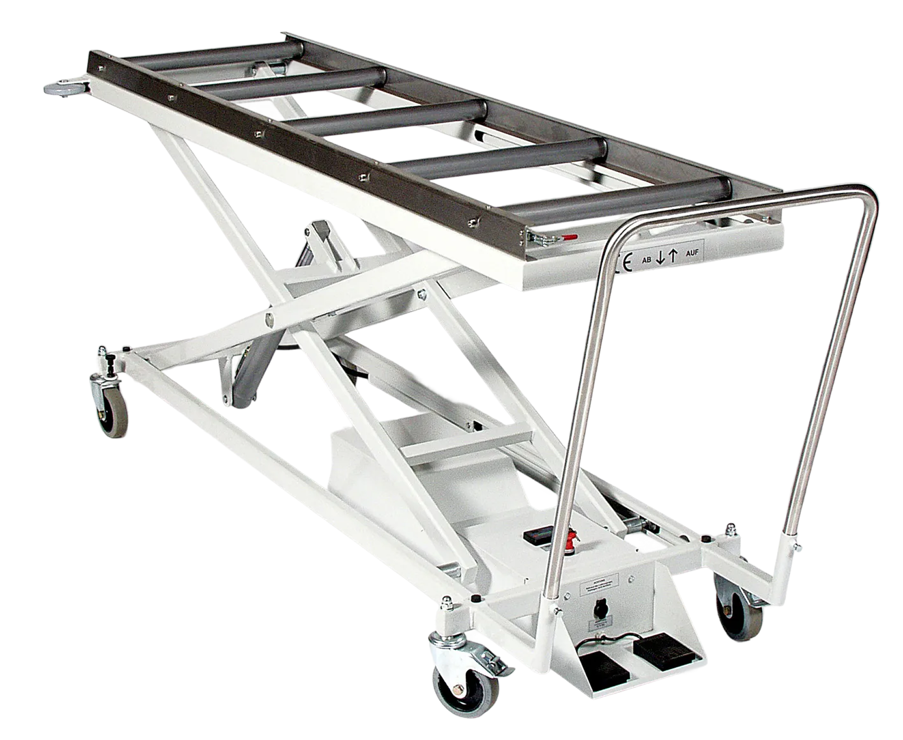 Sturdy, torsion-resistant frame construction, powder-coated steel RAL 7035 with integrated 12-volt hydraulic unit for stepless height adjustment.